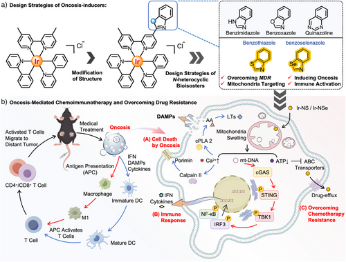 近日,日韩av 巢晖教授团队设计开发了一类线粒体靶向的铱(III)基免疫原性胀亡诱导剂。该类诱导剂不仅能有效突破肿瘤多药耐药瓶颈,还可通过激活机体免疫系统,实现化疗与免疫治疗的协同增效,为癌症治疗提供了新策略(图 1)。研究表明,这类铱(III)基配合物具备多重优势:其一,可通过原位可视化实现细胞内定位追踪,同时显著克服顺铂、阿霉素等临床常用化疗药物的耐药性局限;其二,能高效诱导免疫原性细胞死亡(ICD),并协同激活 cGAS-STING 通路,成功构建 “化疗杀伤–免疫激活” 的协同治疗模式。从作用机制来看,配合物能快速靶向肿瘤细胞线粒体,破坏其结构完整性,同时升高细胞内氧化应激水平、促进钙离子(Ca2+)释放。这一系列变化会进一步激活Calpain和Porimin蛋白,最终在多药耐药肺癌细胞(A549R)中启动胀亡通路。此外,转录组学分析证实,其还能通过重组肌动蛋白细胞骨架、调节 ABC 转运蛋白活性、重塑糖酵解与糖异生代谢途径。