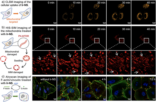 图3. a)铱基胀亡诱导剂的示踪; b)线粒体结构变化; c)细胞骨架变化。