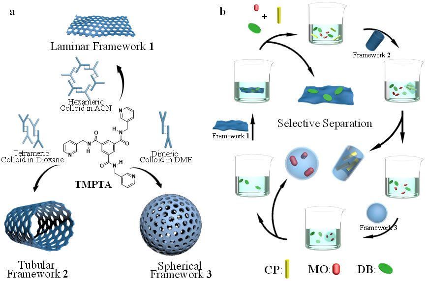 近日,课题组拓扑超分子组装与识别技术,以六聚合环状胶体、四聚合环状胶体以及二聚合环状胶体为前驱体,通过选择性交联构筑层状、管状和球状共价有机框架(COFs)。基于框架的前驱体-胶体的识别性能,层状COFs能够快速吸附盘状污染物(DB),管状COFs与各向异性污染物(CP)具有较强的相互作用,而球状COFs对短棒或等方性的污染物(MO)呈现快速吸附功能。最后,发展多孔COFs结构的选择性识别,实现对三种污染物的有效分离。此研究结果以“Precisely Controlled Multi-dimensional Covalent Frameworks from the Polymerization of Supramolecular Colloids”为标题,发表在Angewandte Chemie International Edition。