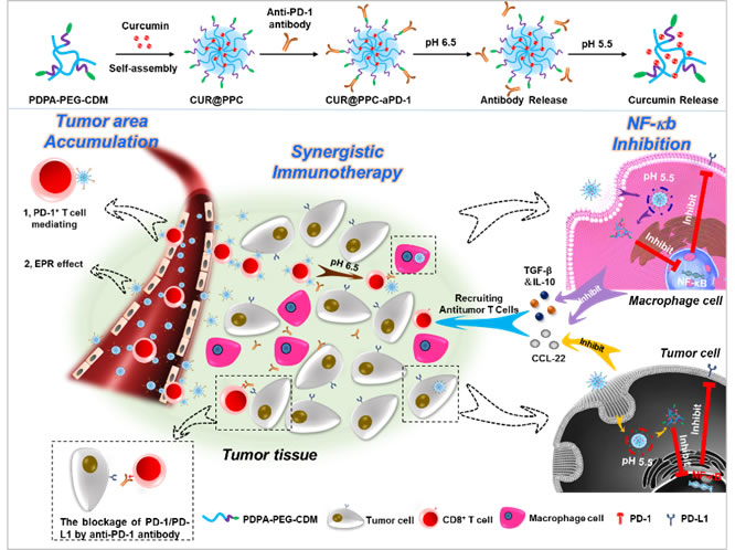 目前,免疫检查点阻断已经成为肿瘤免疫治疗中最具吸引力和最有效的手段之一。其中,通过阻断PD-1/PD-L1免疫检查点,激活T细胞来抑制肿瘤生长的治疗方法,在黑色素瘤和其他多种类型肿瘤的临床治疗中取得了巨大的疗效。但是,由于肿瘤微环境中存在多种免疫逃逸和免疫抑制的机制,仍然有超过一半的肿瘤患者不能响应阻断PD-1/PD-L1免疫检查点的免疫治疗。同时,虽然纳米药物递送体系在协同提高免疫治疗效果的研究中越来越受到关注,但仅仅依靠纳米药物的被动聚集(EPR效应)来实现肿瘤的药物聚集往往比预期的效果更差。因此,纳米药物在免疫治疗方面的治疗潜力依然受到了极大的限制。