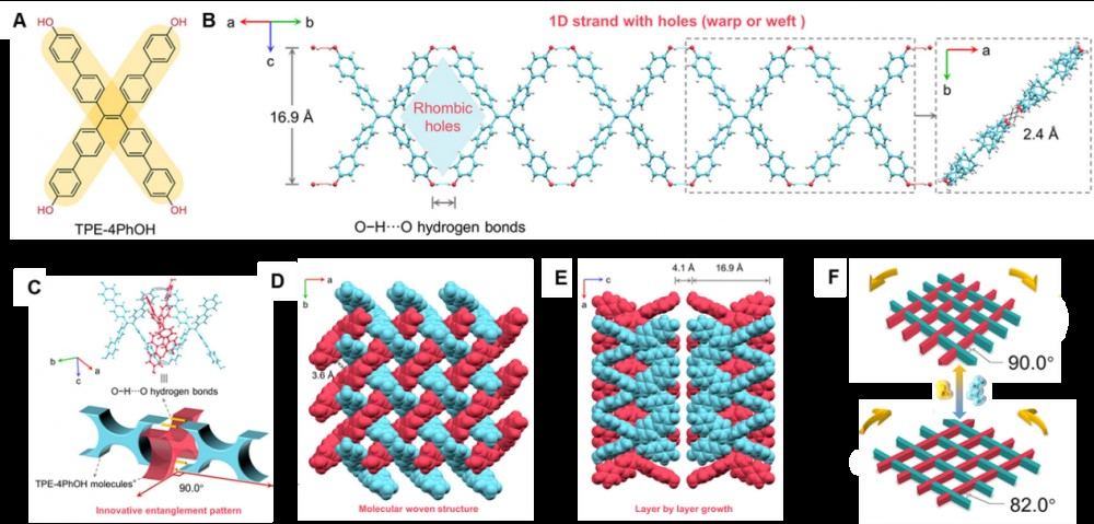 2021年,池振国教授研究团队及其合作者采用独特的编织技法,首次报道了一种由一维带孔长链交织而成的动态二维(2D)编织氢键有机框架(HOF)。他们首先合成四苯酚基取代的四苯基乙烯(TPE)衍生物TPE-4PhOH,并把它作为编织的原材料。随后,通过结晶处理,成功构建了一个编织的HOF(命名为2D-90)。TPE-4PhOH分子呈现出几何上定义良好的X形结构,酚基附着在TPE核心的外围。当每个XTPE-4PhOH与两个相邻分子相互作用,形成四对分子间O-H···O氢键时,TPE-4PhOH组装为一维长链,即编织材料的经线或纬线,长链上带有具有规则间隔的菱形孔。当不同方向例如垂直方向长链上的有机分子插入这些菱形孔中,进而展现出由一维长链构造的互锁模式。在单晶结构的c轴上可以观察到双轴的编织结构,经纬线夹角为90.0°。同时,在单晶结构的a轴和b轴上可以观察到非常规整的层状结构,表明这是一个二维编织结构。此外,研究者还利用TEMHRTEMcryo-EMAFM和理论模拟等多种手段对其单晶结构进行了深入而全面的研究。
