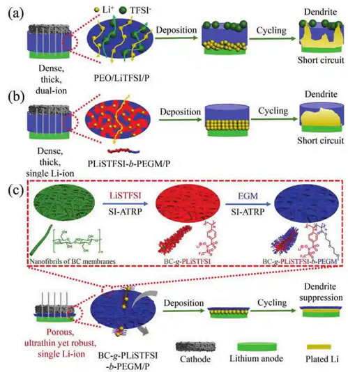 最近,日韩av 吴丁财教授课题组受软硬试管刷的启发,设计合成了一种具有硬纳米纤维骨架和软功能聚合物侧链的新型超结构聚合物分子刷BC-g-PLiSTFSI-b-PEGM,并进一步引入增塑剂,得到单锂离子导体准固态聚合物刷电解质(SLIC-QSPBEs)。对于所制备的 SLIC-QSPBEs,细菌纤维素(BC)纳米纤维骨架提供了强劲的机械性能,并形成了高度多孔的三维纳米网络结构,具有丰富可移动锂离子的聚(4-苯乙烯磺酰-三氟甲基磺酰亚胺)(PLiSTFSI)保证了单一的锂离子传导行为,聚二甘醇单甲基醚甲基丙烯酸酯(PEGM)提供了锂离子传输基质。所制备的SLIC-QSPBEs兼具超薄(10 μm)和优异的机械性能(杨氏模量 = 1.9 GPa)。得益于上述独特的纳米拓扑结构和多功能组分的协同效应,SLIC-QSPBEs可以有效地消除浓差极化,提高机械性能,增强离子传输以及降低界面阻抗。基于超薄而坚固的SLIC-QSPBEs组装Li|Li对称电池,在电流密度为1 mA cm-2时,可逆实现稳定的镀锂/剥锂超过3300 h以上。这项工作为开发新型固态锂金属电池电解质提供了一种很有前景的策略。
