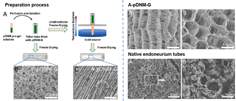 图1. 具有取向微通道结构的A-pDNM-G导管的制备与SEM表征。