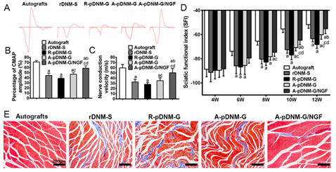图3. 大鼠坐骨神经损伤后移植A-pDNM-G导管12周后再生神经的功能恢复情况。