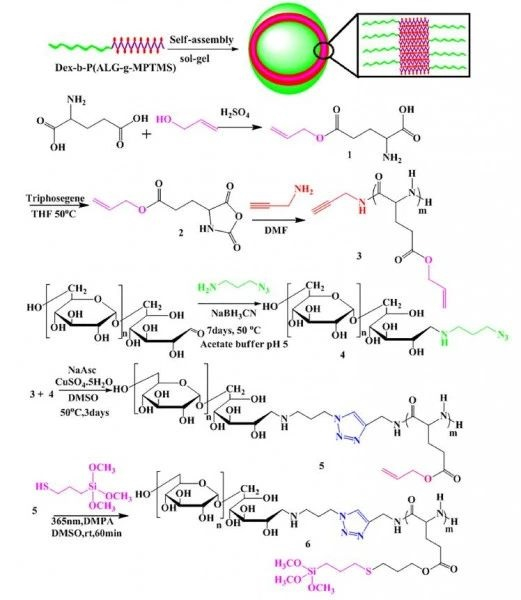 日韩av 材料科学与工程十大日韩av平台 张黎明教授课题组对含三甲氧基硅烷侧基的两亲性葡聚糖/聚-L-谷氨酸酯嵌段聚合物衍生物的合成、核交联有机/机杂化纳米胶束的制备以及药物释放开展了以下研究工作:首先利用“叠氮-炔基”点击反应合成葡聚糖/聚(γ-丙烯基-L-谷氨酸酯)嵌段聚合物 (Dex-b-PALG),后使用“巯基-乙烯基”点击反应将(3-巯基丙基)三甲氧基硅烷 [(3-Mercaptopropyl)trimethoxysilane (MPTMS)]引入聚(γ-丙烯基-L-谷氨酸酯)链段上制得含三甲氧基硅烷侧基的两亲性葡聚糖/聚-L-谷氨酸酯嵌段聚合物衍生物[Dex-b-P(ALG-g-MPTMS)] (图 1),后经过自组装与水解交联作用,得到核交联的有机/机杂化纳米胶束。用光散射、透射电镜等分析测试手段对该类杂化纳米胶束进行表征;研究了不同的制备条件对所得杂化纳米胶束粒径与形貌的影响,最后通过药物释放实验与体外细胞毒性试验研究了杂化纳米胶束作为药物载体的应用前景。