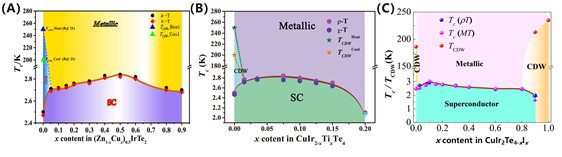 具有层状的过渡金属硫化物(TMDs)由于具有可调带隙和丰富的物理性质,是研究各种量子态和结构序之间相互作用的良好材料。特别是电荷密度波(CDW)与超导电性(SC)之间的相互作用,已成为凝聚态物理的重要研究课题之一。超导电性和电荷密度波是两种不同的电子态,两者均起源于电声子耦合和费米面失稳。在电荷密度波和超导共存图像中,进入电荷密度波态后,由于费米面的嵌套而打开能隙,从而导致态密度的丢失,表现出电荷密度波与超导相竞争的行为。人们可以通过增加压力或化学掺杂等手段压制电荷密度波态,超导临界转变温度随电荷密度波态压制,会展现穹顶状的行为。目前已发现的具有层状结构的过渡金属硫化物同时具有超导电性及电荷密度波相变,如典型的2H-NbSe2,2H-TaSe2等过渡金属二硫化物;或者可以通过化学掺杂或物理压力抑制这些母体(如1T-TiSe2,1T-TaS2)的电荷密度波相变,从而出现超导电性。尽管过渡金属硫化物超导材料的探索研究取得了重要的进展,但是目前研究人员主要集中于层状过渡金属硫硒化合物超导体的研究,层状金属碲化物超导体的报道相对较少,另一方面电荷密度波的形成机制与超导的竞争关系仍悬而未决。
